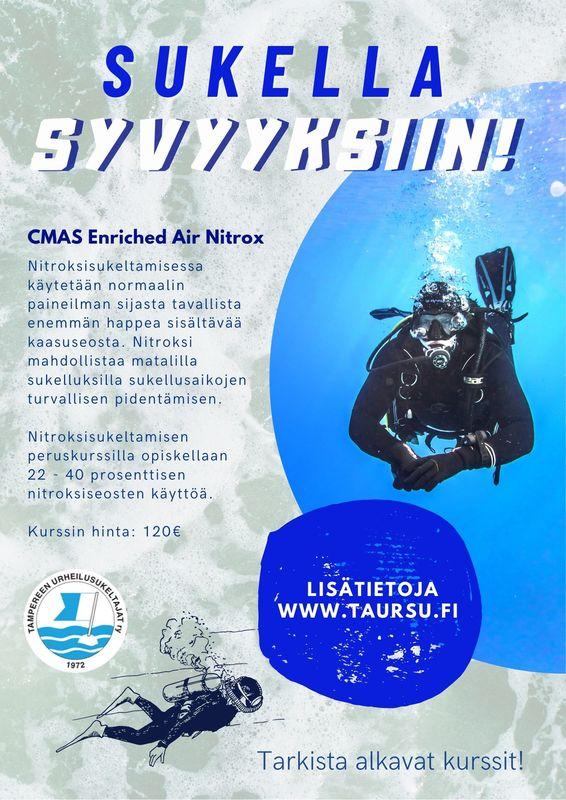 Nitroksisukeltamisen peruskurssilla opiskellaan 22 - 40 prosenttisen nitroksiseosten käyttöä urheilusukeltamisessa. Kurssiin kuuluu kaksi teoriaopetuskertaa ja teoriakoe. Kurssi ei sisällä pakollisia allas- tai avovesisukelluksia, mutta oppilaille annetaan mahdollisuus sukeltaa hapella rikastetulla ilmalla kurssin yhteydessä 1-2 kertaa. Kurssilla noudatetaan Sukeltajaliiton järjestämisohjetta. Kurssin jälkeen voi osallistua mm. CMAS Nitrox Gas Blender -kurssille, jossa opetellaan turvallinen kaasujen sekoittaminen omiin pulloihin.